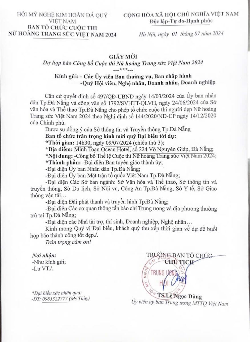 Căn cứ Quyết định số 497/QĐ-UBND ngày 14/03/2024 của Ủy ban nhân dân Tp. Đà Nẵng và Công văn số 1792/SVHTT-QLVH, ngày 24/06/2024 của Sở Văn hóa và Thể thao Tp. Đà Nẵng cho phép tổ chức cuộc thi người đẹp Nữ hoàng Trang sức Việt Nam 2024 theo Nghị định số 144/2020/NĐ-CP ngày 14/12/2020 của Chính phủ.