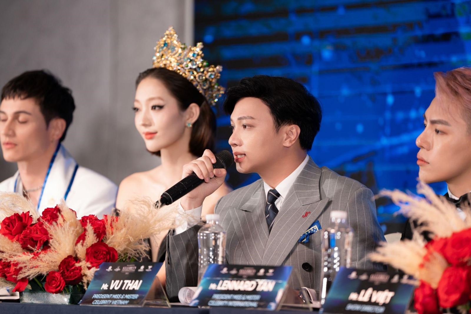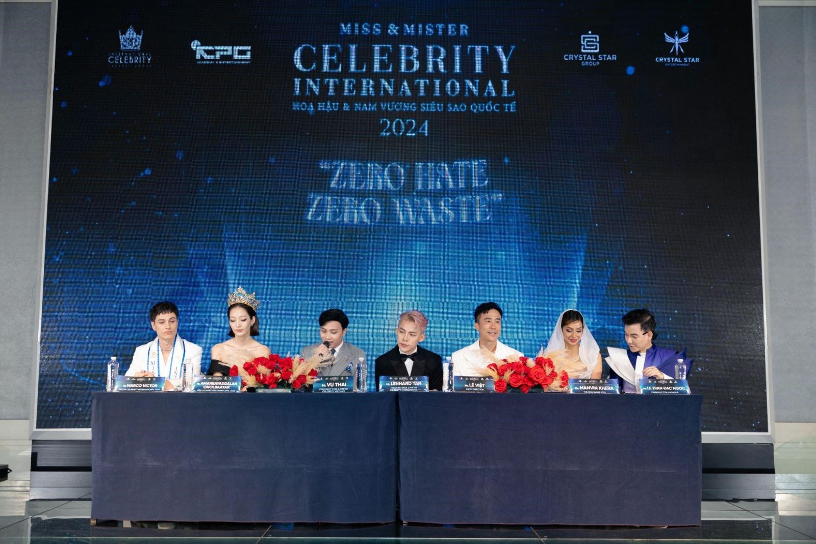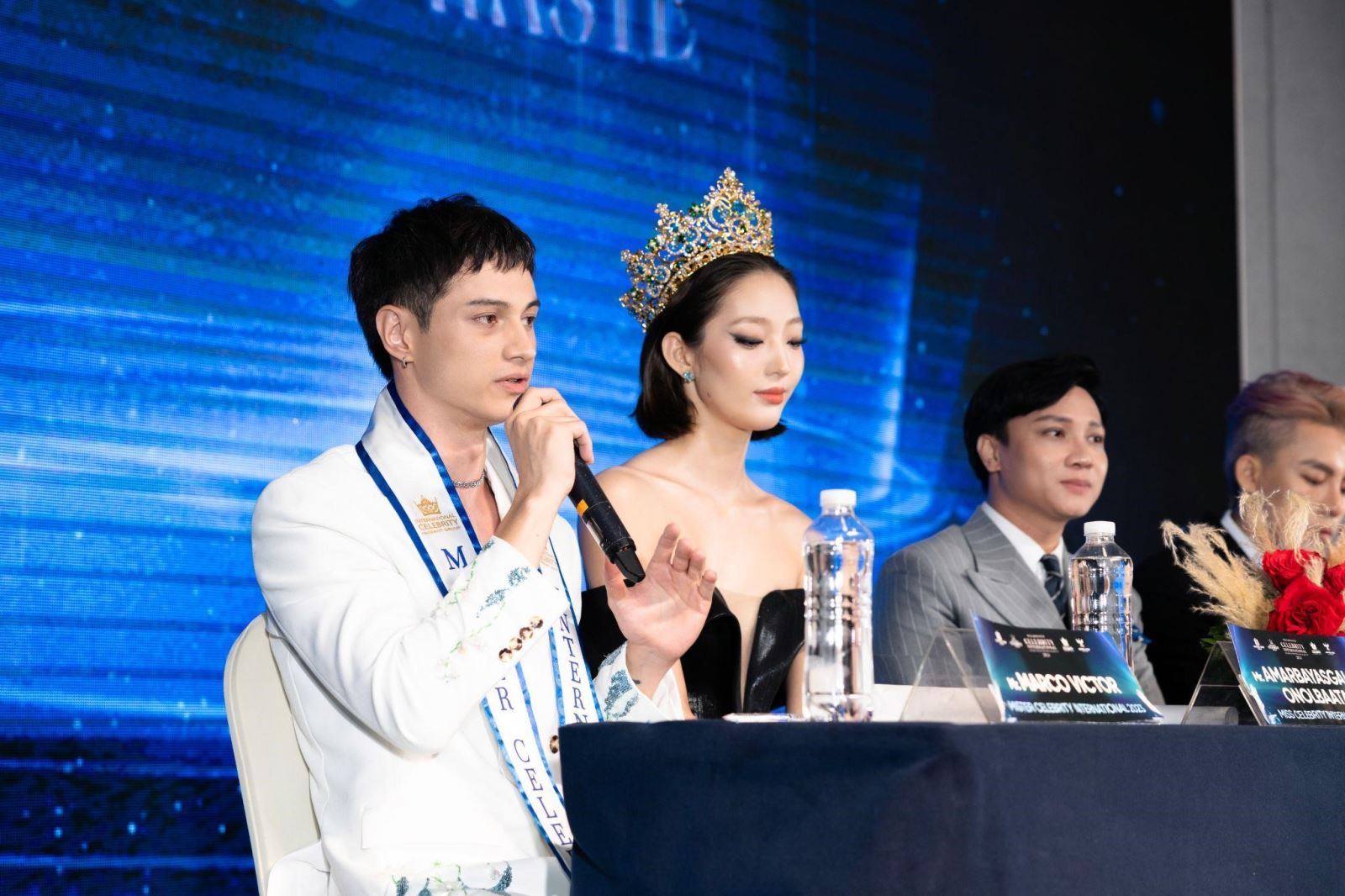 Các đại biểu trả lời phỏng vấn báo chí của cuộc thi Miss & Mister Celebrity International 2024 từ trái qua phải lần lượt là Mister Celebrity International 2023 - Marco Victor, Miss Celebrity International 2023 - Amarbayasgalan Onolbaatar, chủ tịch cuộc thi tại Việt Nam - Vũ Thái, chủ tịch cuộc thi quốc tế - Lennard Tan, đạo diễn Lê Việt, đương kim Hoa hậu Miss Globe 2023 - Manvin Khera, NTK Lê Trần Đắc Ngọc