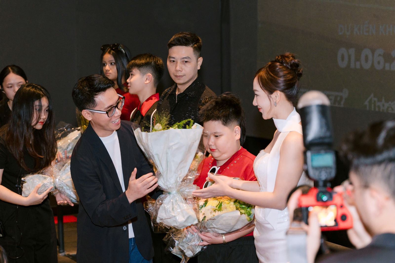 Đạo diễn Đồng Công Hiếu - Giám đốc Việt art film tặng những bó hoa tươi thắm cho diễn viên, đạo diễn và ekip đoàn phim