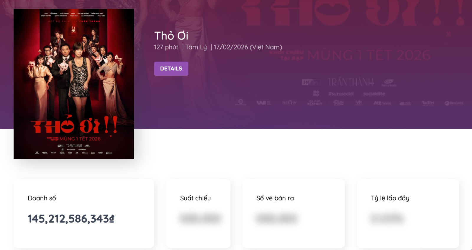 Theo số liệu từ Box Office Vietnam, tính đến chiều 20/2, phim điện ảnh ''Thỏ ơi!!'' do Trấn Thành đạo diễn và đóng chính đã vượt mốc 145 tỉ đồng, tạm dẫn đầu cuộc đua phim Việt dịp Tết Bính Ngọ 2026.