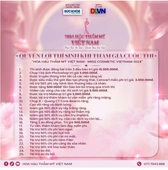 Cuộc thi "Hoa hậu Thẩm mỹ Việt Nam - Miss Cosmetic Vietnam" 2024, không đơn thuần là sân chơi mà còn là nơi giúp các thí sinh rèn luyện bản thân, nâng cao sự tự tin và sẵn sàng tỏa sáng trên sân khấu, được trải nghiệm giá trị làm đẹp đích thực tại các bệnh viện, cơ sở thẩm mỹ uy tín. Điều này không chỉ giúp họ tự tin hơn về ngoại hình, mà còn là cơ hội để thể hiện sự chăm sóc bản thân và trau dồi vẻ đẹp toàn diện.