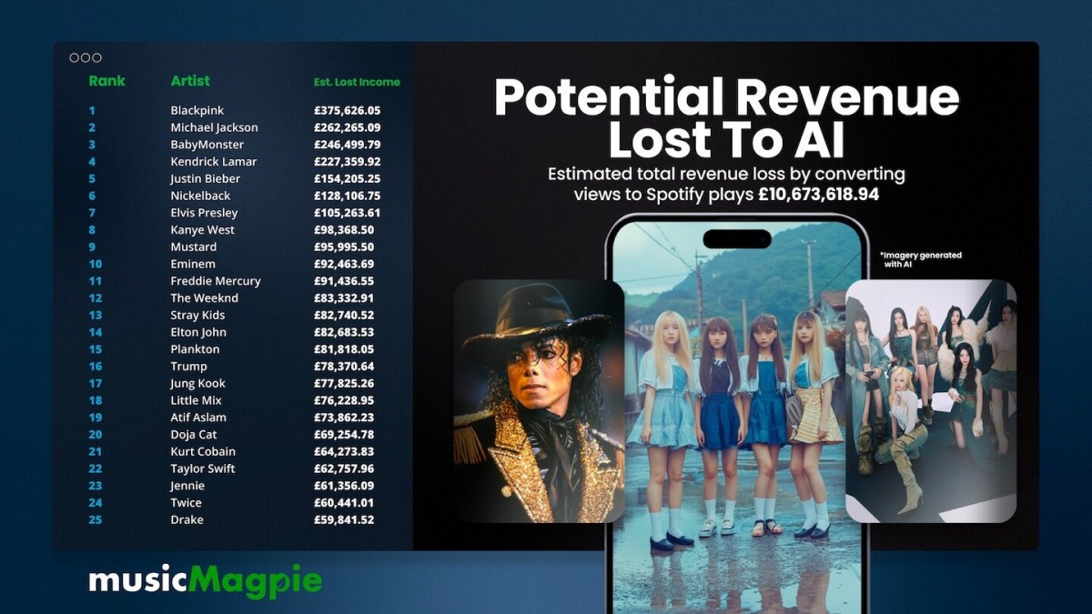 Đồng thời, phân tích từ Music Magpie cũng tiết lộ rằng BlackPink ước tính mất khoảng 376.184 bảng Anh (khoảng 500.000 USA) do AI. Ở vị trí thứ 2 và thứ 3 lần lượt là Michael Jackson (262.265 bảng Anh, hoặc khoảng 346.000 USD) và BABYMONSTER (246.499 bảng Anh, hoặc khoảng 325.000 USD).