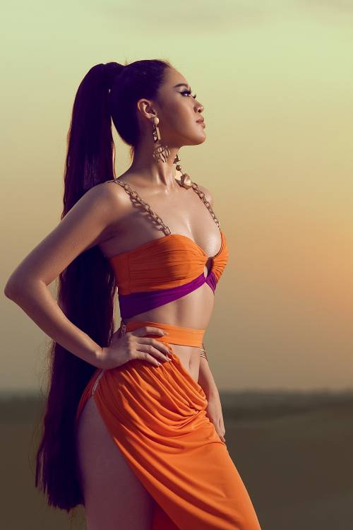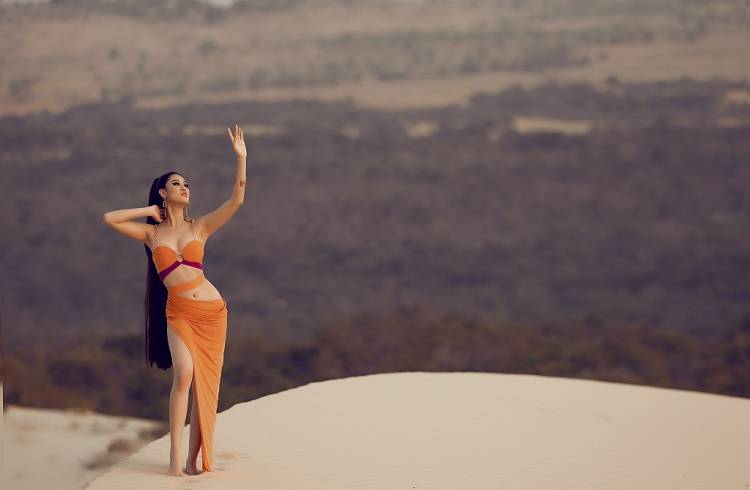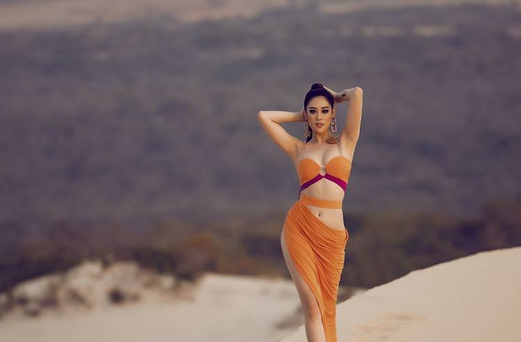 Nhân dịp này, Khánh Vân cũng gửi tặng khán giả bộ ảnh nóng bỏng thực hiện trên đồi cát, thay cho lời cảm ơn. Tone màu cam rực rỡ làm nổi bật làn da của Khánh Vân, đây cũng là gam màu cô chọn cho trang phục dạ hội bán kết và chung kết tại Miss Universe, gắn bó với Khánh Vân ở nhiều sự kiện ý nghĩa nên với cô, màu cam là màu sắc rất đặc biệt.