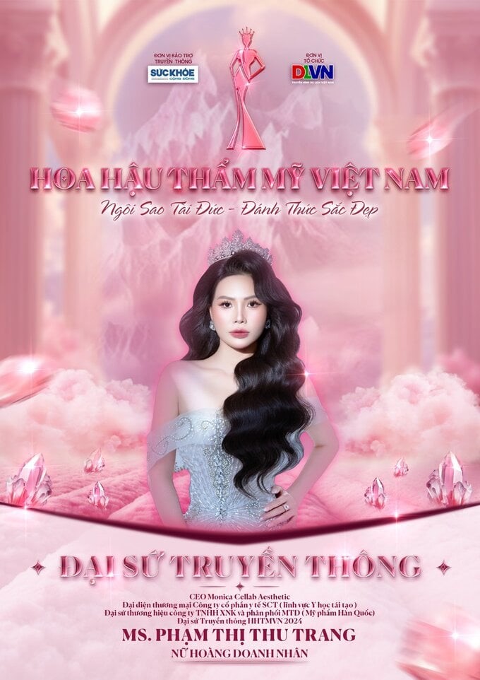 Nữ hoàng doanh nhân Phạm Thị Thu Trang, sở hữu nét đẹp trẻ trung với nguồn năng lượng tích cực, chị hoạt động sôi nổi trong mọi lĩnh vực mình tham gia và gặt hái nhiều kết quả đáng mơ ước. Được biết, cô đang là Đại sứ Truyền thông cuộc thi ''Hoa hậu Thẩm mỹ Việt Nam'' 2024.