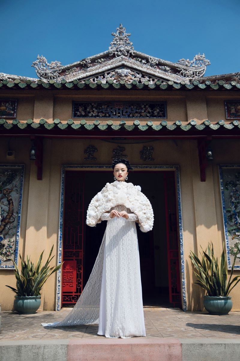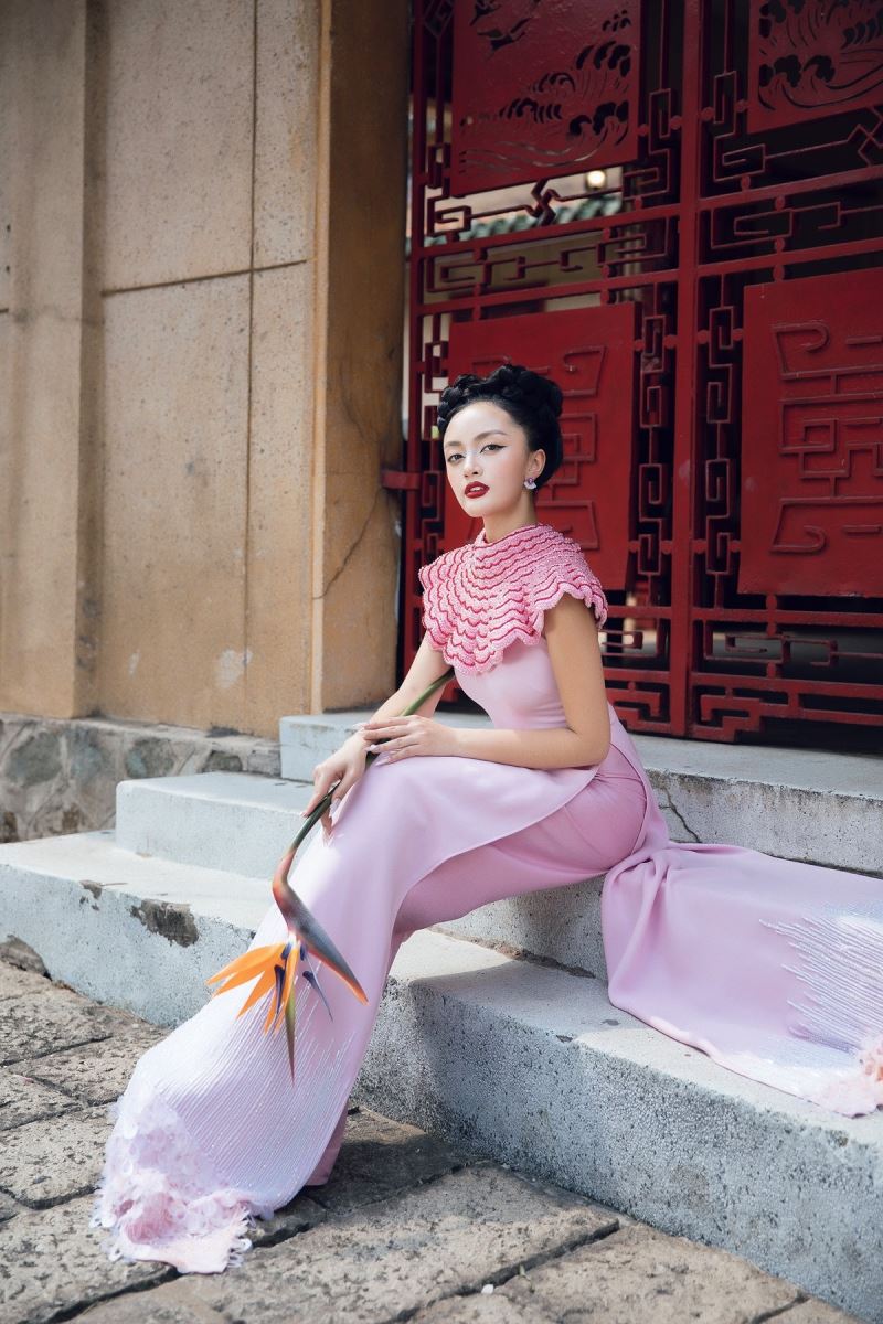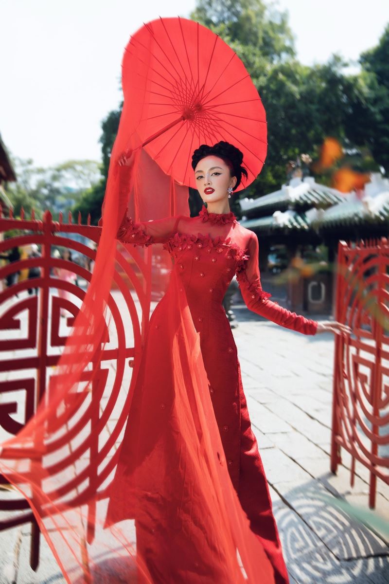 Khác với những phom dáng truyền thống trước đây, trong bộ sưu tập lần này, nhà thiết kế Minh Châu cho thấy sự phá cách với những thiết kế nhiều màu sắc rực rỡ như hồng tươi, trắng, đỏ… Những mẫu áo dài này là sự kết hợp giữa nhiều chất liệu mới, trong đó có lông vũ, voan lưới… cùng kỹ thuật đính hạt cùng chi tiết cổ yếm, cô xếp tầng… giúp Nicole Hồ trở nên sang trọng, quý phái hơn khi xuống phố.