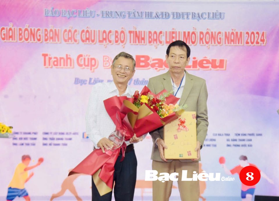 Dịp này, Ban tổ chức cũng đã tặng hoa, quà tri ân ông Nguyễn Minh Chánh - nguyên Tổng Biên tập, nguyên Chủ tịch Hội Nhà báo Việt Nam tỉnh Bạc Liêu, người sáng lập và là Trưởng ban tổ chức các giải bóng bàn Báo Bạc Liêu (lần thứ nhất đến lần thứ tư, từ năm 1997 - 2010) - (ảnh 8).
