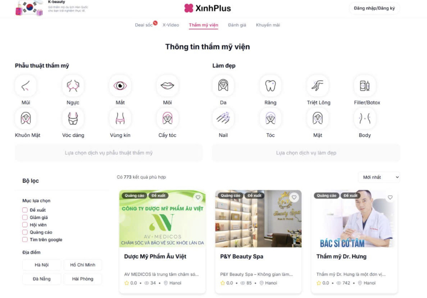 Sau khi ra mắt phiên bản beta vào ngày 9 tháng 6 vừa qua và bắt đầu cung cấp dịch vụ tập trung tại khu vực Hà Nội, XinhPlus hiện đã bổ sung tính năng mới cho phép tìm kiếm các bệnh viện và phòng khám thẩm mỹ trên toàn quốc Việt Nam, mang đến cho người dùng nhiều lựa chọn hơn. Nhờ đó, người dùng có thể dễ dàng tìm kiếm và so sánh các cơ sở thẩm mỹ mong muốn dù đang sinh sống ở bất kỳ khu vực nào.