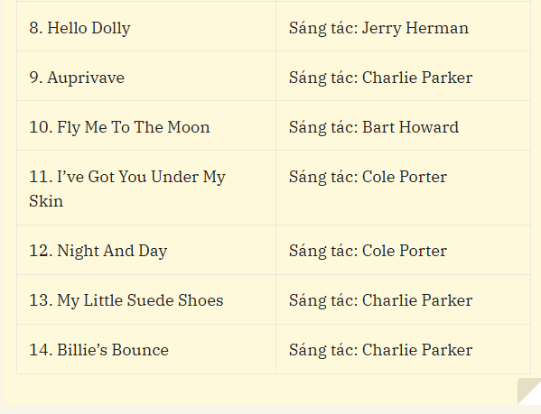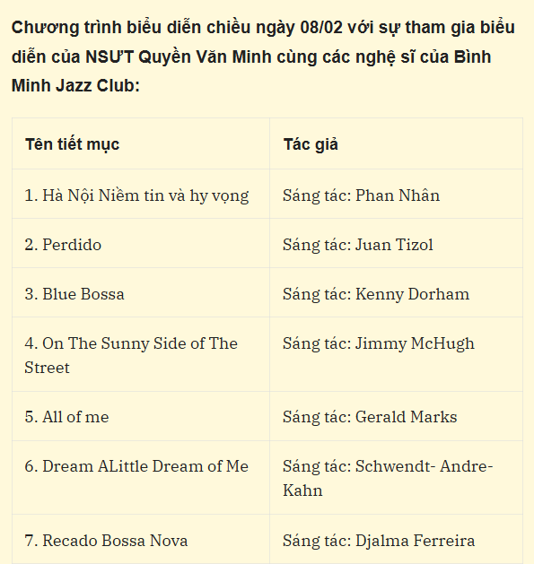 Mở đầu chương trình là ca khúc quen thuộc “Hà Nội – Niềm tin và hy vọng” – một sáng tác của nhạc sĩ Phan Nhân nhưng được làm mới trong bản phối jazz hiện đại, như một lời chào đầy tự hào gửi tới Thủ đô ngàn năm văn hiến. Tiếp đó là loạt tác phẩm bất hủ của Jazz thế giới như Perdido, Blue Bossa, Recado Bossa Nova, hay các sáng tác của “huyền thoại” Charlie Parker như Auprivave, My Little Suede Shoes, Billie’s Bounce.