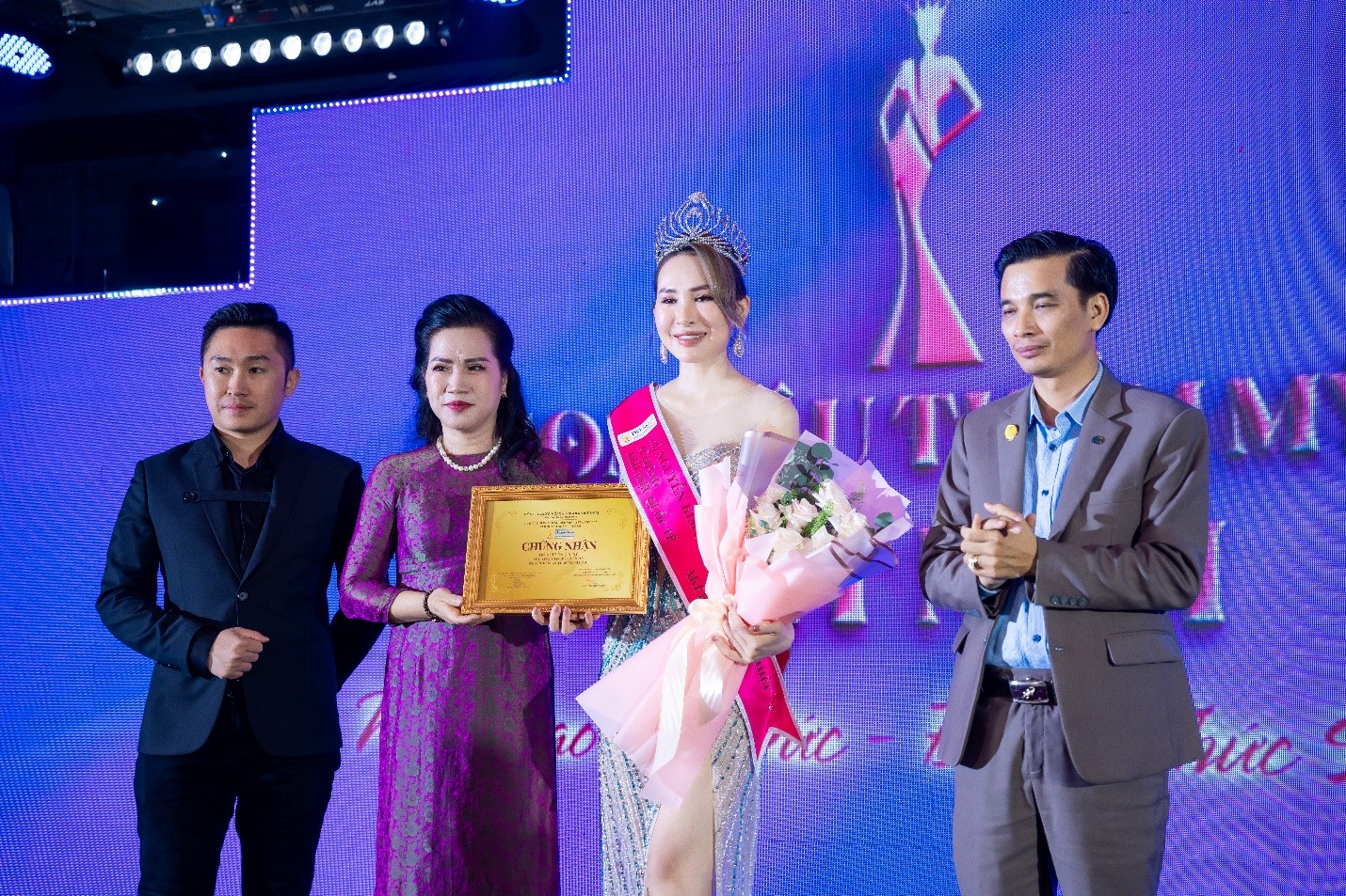 Bà Nguyễn Thị Thanh – Chủ tịch CLB Doanh nhân Việt Nam (vị trí thứ hai, từ bìa trái), Ông Lê Phương Lĩnh – Phó chủ tịch CLB Doanh nhân Việt Nam (ngoài cùng, bìa phải) trao hoa và sash cho Hồ Nguyễn Kim Sỹ – Nữ Hoàng Nhân hiệu Quốc tế