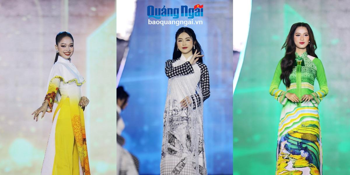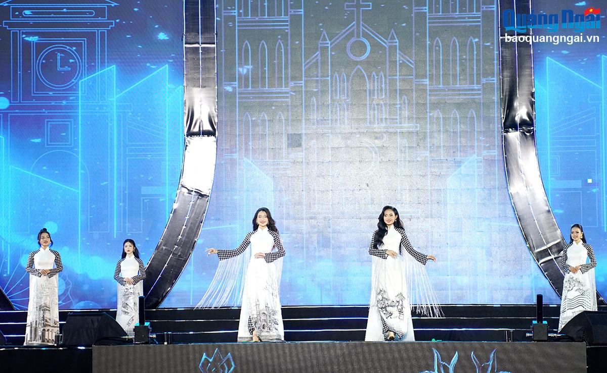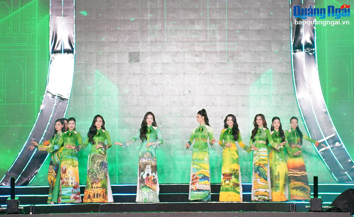 Phần thi trình diễn trang phục áo dài miền Bắc với những hình ảnh danh lam thắng cảnh được in trên tà áo