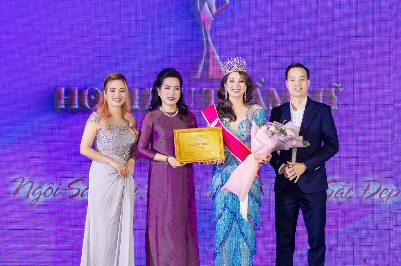 Bà Nguyễn Thị Thanh – Chủ tịch CLB Doanh nhân Việt Nam (vị trí thứ hai, từ bìa trái) và Ông Đinh Quang Hòe – Chủ tịch Học viện Thẩm mỹ Quốc tế EvaXinh (ngoài cùng, bìa phải), Bà Đỗ Thị Thu Trang - TGĐ Học viện Thẩm mỹ Quốc tế EVAXINH (ngoài cùng, bìa trái) trao hoa và sash cho NIE PHAM – Nữ Hoàng Sức Khỏe Cộng Đồng