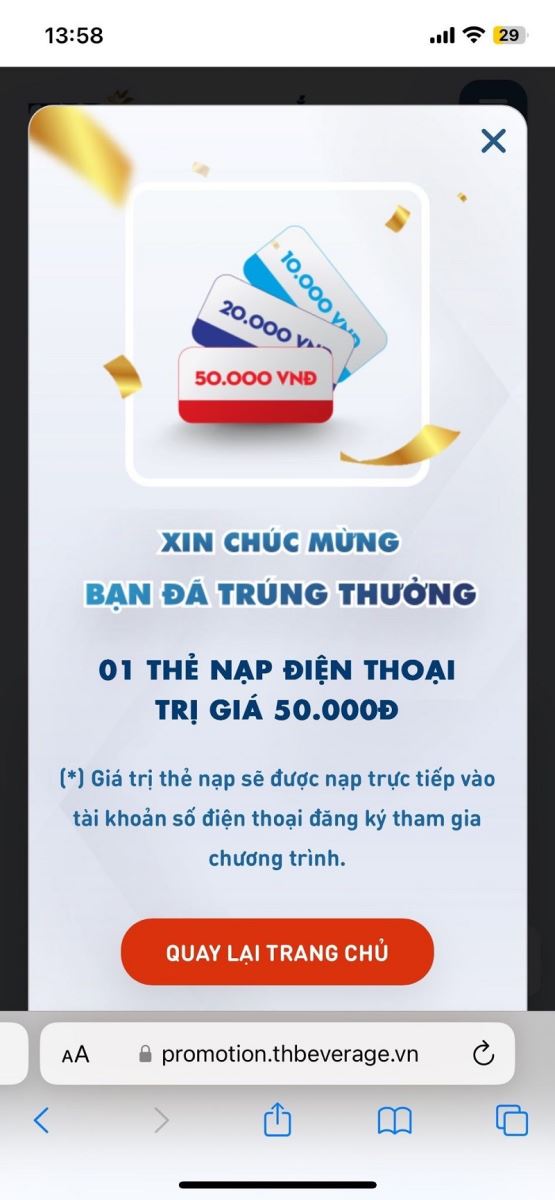 Minh Châu (nhân viên văn phòng, Hà Nội) hào hứng khoe phần thưởng nhận được sau khi chăm bóc nhãn chai: "Đồ uống thơm ngon, tự nhiên, đã khát, sảng khoái, cách chơi lại nhanh, gọn, đơn giản nên mình rất thích tham gia để có cơ hội nhận quà. Mình mới uống sương sương 2 chai TH true JUICE milk việt quất mà được 50k thẻ nạp điện thoại".