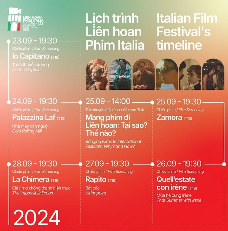 Liên hoan phim Italia 2024 sẽ diễn ra tại Trung tâm Chiếu phim Quốc gia (87 Láng Hạ, Ba Đình, Hà Nội) từ ngày 23 - 28/9, với 6 bộ phim đặc sắc của điện ảnh Italia.