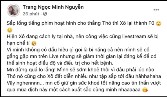 Ca sĩ Lương Minh Trang bất ngờ thông báo trên trang cá nhân mình đã bị nhiễm Covid-19.