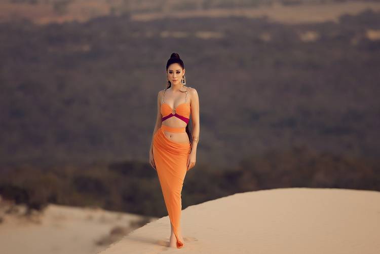 Nhân dịp này, Khánh Vân cũng gửi tặng khán giả bộ ảnh nóng bỏng thực hiện trên đồi cát, thay cho lời cảm ơn. Tone màu cam rực rỡ làm nổi bật làn da của Khánh Vân, đây cũng là gam màu cô chọn cho trang phục dạ hội bán kết và chung kết tại Miss Universe, gắn bó với Khánh Vân ở nhiều sự kiện ý nghĩa nên với cô, màu cam là màu sắc rất đặc biệt.