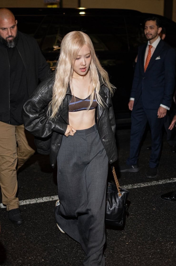 Ở một lựa chọn khác, Rosé tạo điểm nhấn với bra top kết hợp chân váy công sở cạp cao và áo khoác da dáng rộng. Sự đối lập giữa phom ôm sát và thiết kế quá khổ mang lại hiệu ứng thị giác thú vị, đồng thời làm nổi bật vẻ gợi cảm một cách tiết chế.