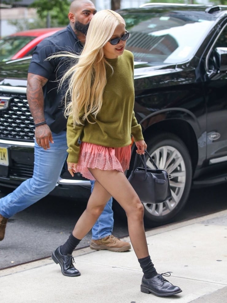 Nữ ca sĩ cũng thường xuyên xuất hiện với những set đồ mang hơi hướng nữ tính mềm mại. Cô từng phối váy ngủ cùng áo len mỏng, hoàn thiện bằng giày oxford và túi xách của The Row. Thương hiệu này được biết đến với triết lý thiết kế tối giản và chất liệu cao cấp, phù hợp với phong cách mà Rosé theo đuổi.