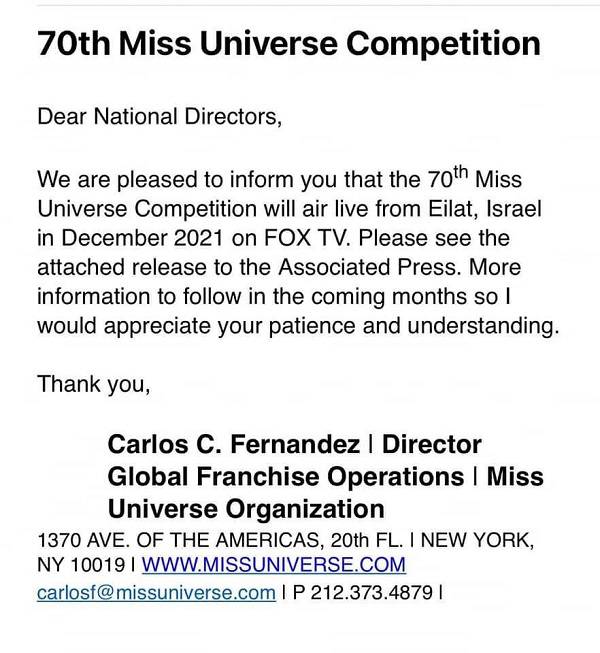 Tối 20/7, cộng đồng fan sắc đẹp vô cùng bất ngờ khi ban tổ chức Miss Universe công bố thời gian và địa điểm diễn ra cuộc thi lần thứ 70. Theo đó, vòng chung kết của đấu trường nhan sắc này sẽ được diễn ra vào tháng 12/2021 tại thành phố Eilat, Israel. Trước đó, nhiều thông tin cho rằng Hoa hậu Hoàn vũ 2021 sẽ được tổ chức tại Costa Rica.